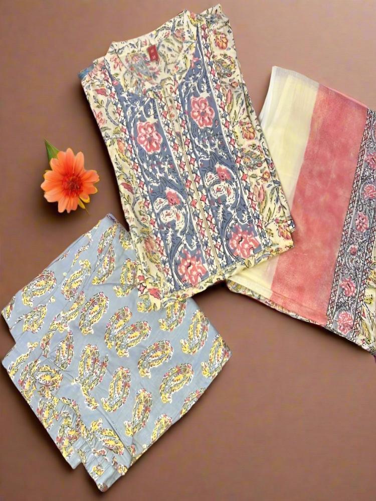 Beige Floral Printed Cotton Kurta with Pant and Dupatta Set