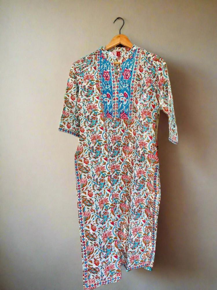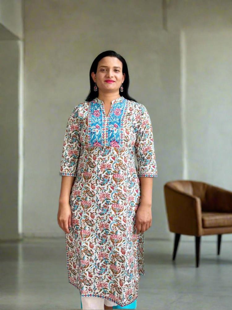 Kurta Details: Fabric: 100% Pure Cotton Neckline: Mandarin collar neck Sleeves: 3/4th sleeves Length: Knee length, perfect for both casual and formal occasions Care Tip: Machine washable and easy to maintain, making it a practical choice for your busy lifestyle. Style Tip: • Pair with jeans and straight pants. • Add a pair of block heels or comfortable flats to complete your outfit. Note: Slight color changes are expected due to camera settings and lighting effects, due to which exchange or return is not accepted. |