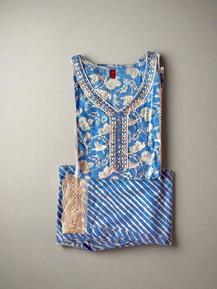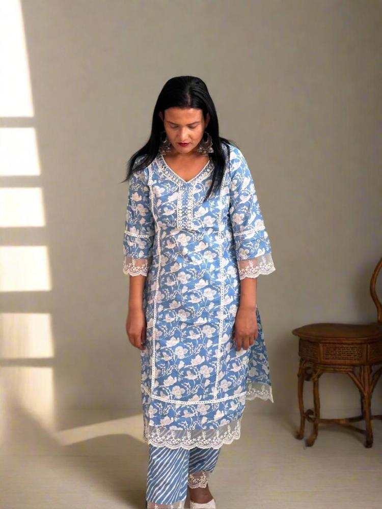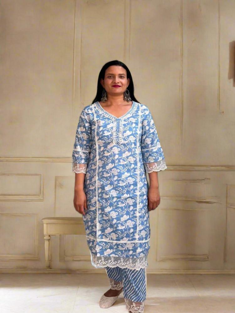 Sky Blue Printed Lace work Kurta & Trouser