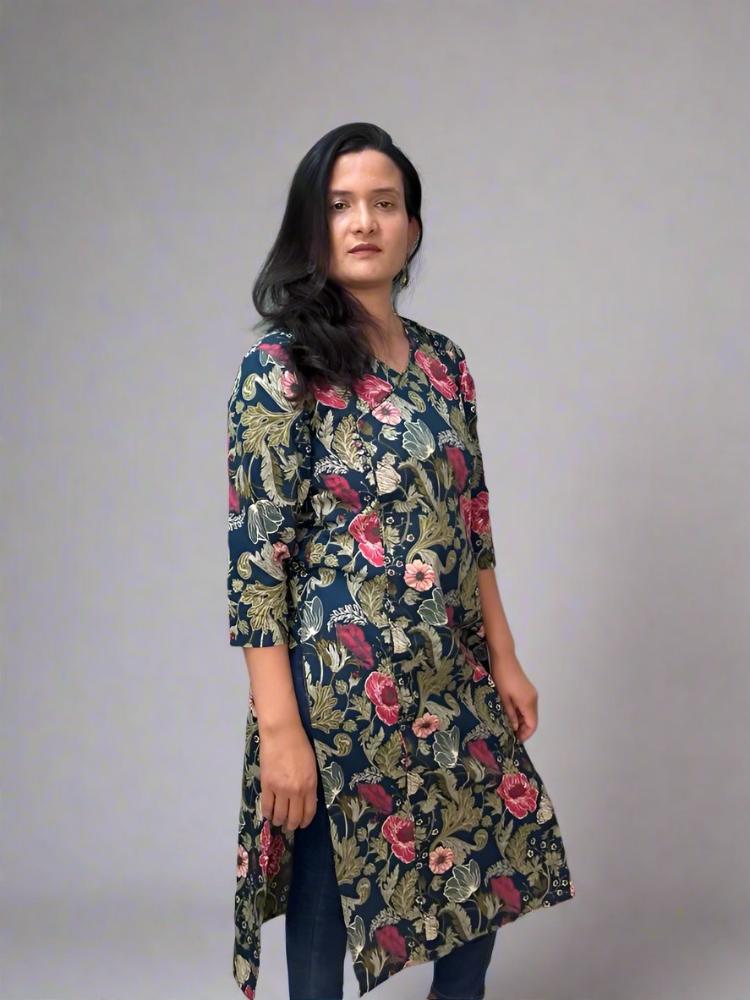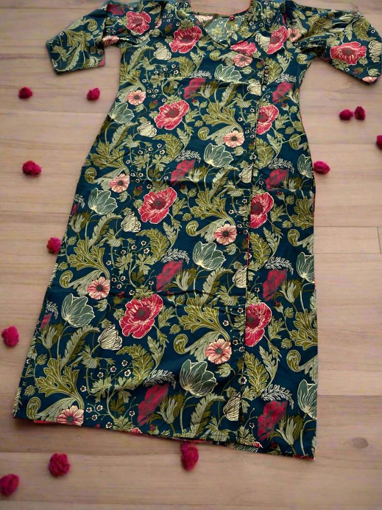 Kurta Details: Fabric: 100% Pure Cotton Neckline: Elegant V neck Sleeves: 3/4th sleeves Length: Knee-length, perfect for both casual and formal occasions Care Tip: Machine washable and easy to maintain, making it a practical choice for your busy lifestyle. Style Tip: • Pair with jeans and straight pants. • Add a pair of block heels or comfortable flats to complete your outfit. Note: Slight colour changes are expected due to camera settings and lighting effects, due to which exchange or return is not accepted. |