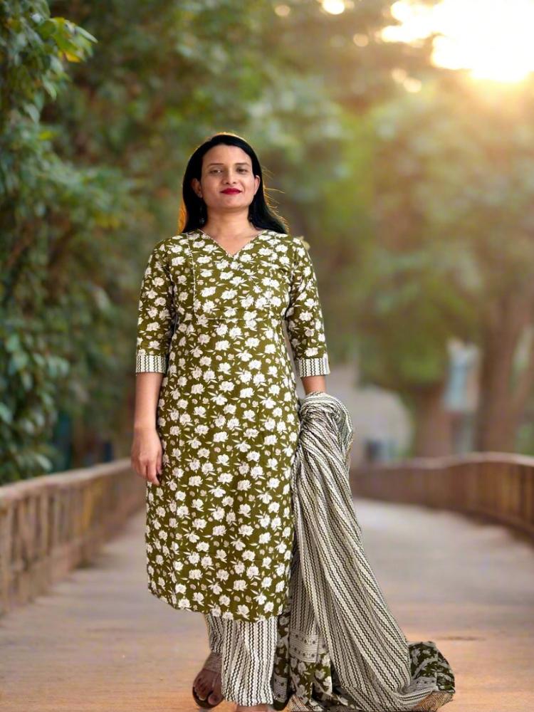 Olive Green Floral Printed Kurta & Trouser with Dupatta set