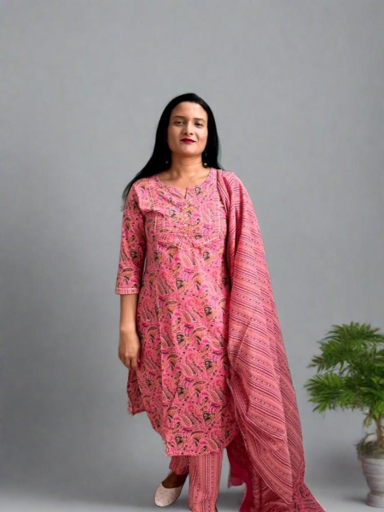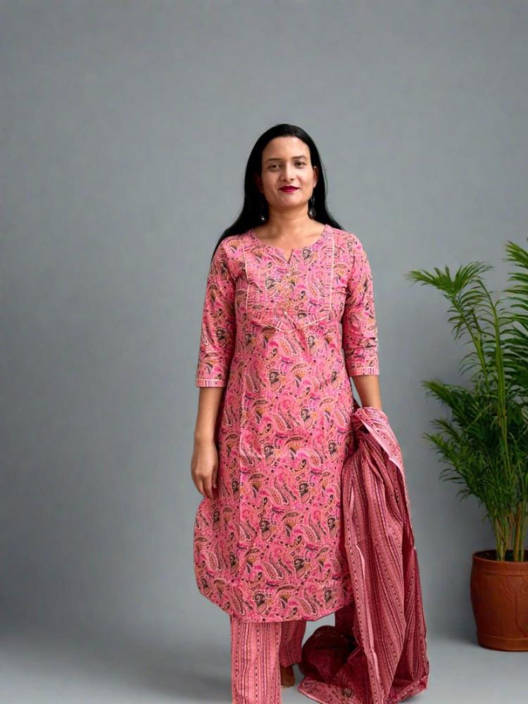Salmon Pink Printed Straight Kurta & Pant with Dupatta