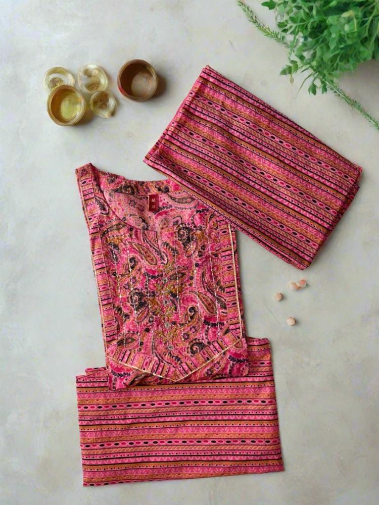 Kurta Details: Fabric: Premium Cotton Neckline: Round Neck with Gotta Patti work Sleeves: 3/4th sleeves Length: Knee length, perfect for both casual and formal occasions Bottom Details: Fabric: Soft and breathable cotton Length: Ankle-length, creating a sophisticated look Care Tip: Machine washable and easy to maintain, making it a practical choice for your busy lifestyle. Style Tip: • Pair with simple accessories for a comfortable yet stylish look. Note: Slight color changes are expected due to camera settings and lighting effects, due to which exchange or return is not accepted. |