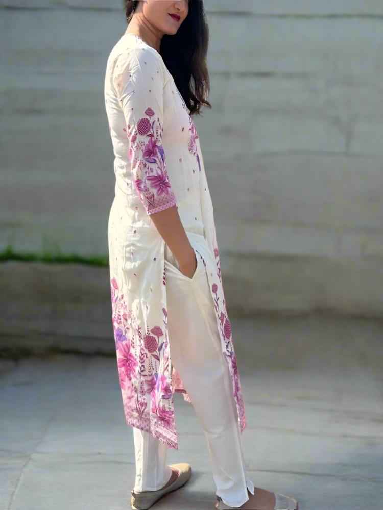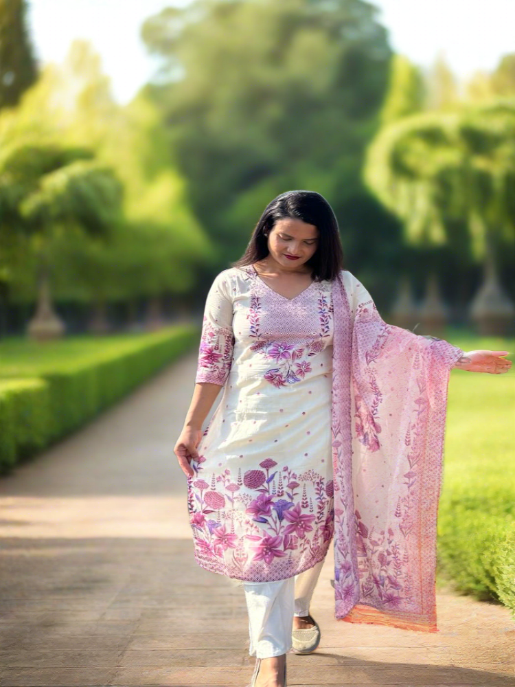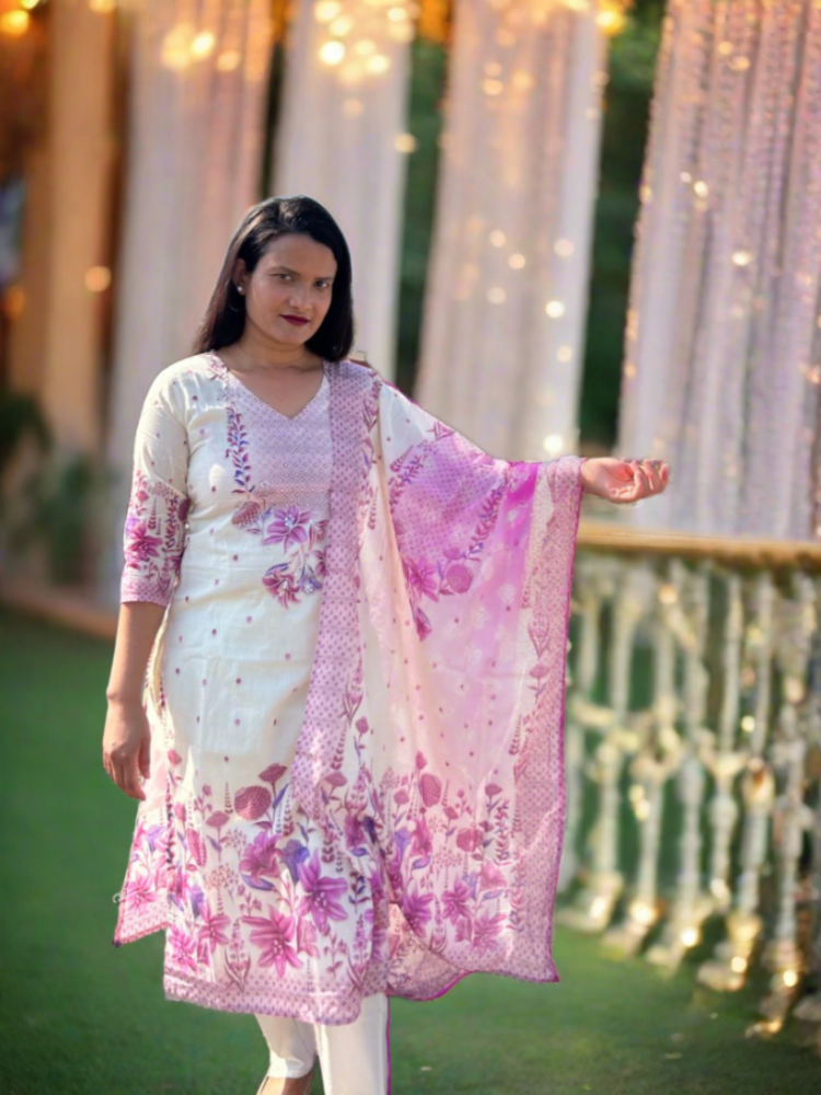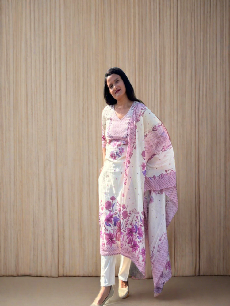 White and Purple Floral Printed Kurta Pant with Dupatta Set