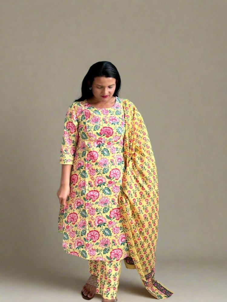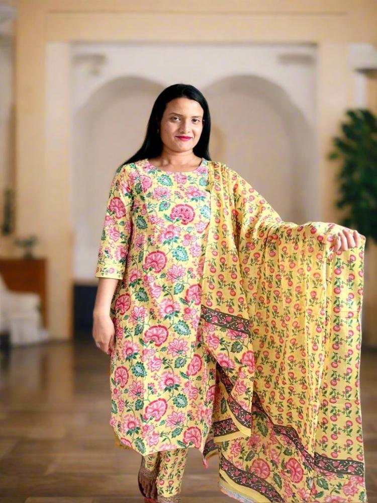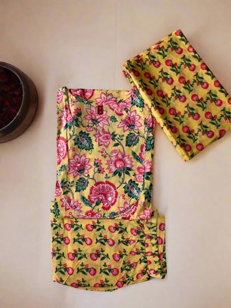 Kurta Details: Fabric: Premium Cotton Neckline: Round Neck with kota doria work Sleeves: 3/4th sleeves Length: Knee length, perfect for both casual and formal occasions Bottom Details: Fabric: Soft and breathable cotton Length: Ankle-length, creating a sophisticated look Care Tip: Hand wash separately in cold water and hang dry in shade. Style Tip: • Pair with statement jewelry such as chunky necklaces, chandelier earrings, or traditional bangles to add a touch of glam. Note: Slight colour changes are expected due to camera settings and lighting effects, due to which exchange or return is not accepted. |