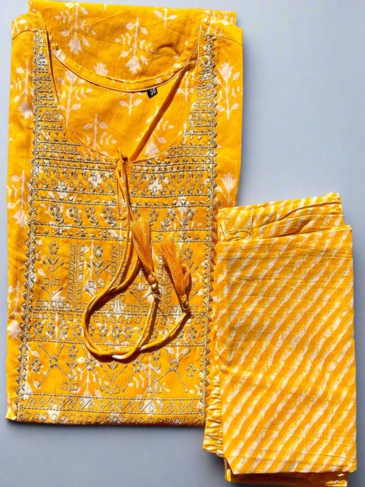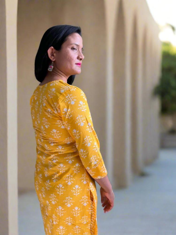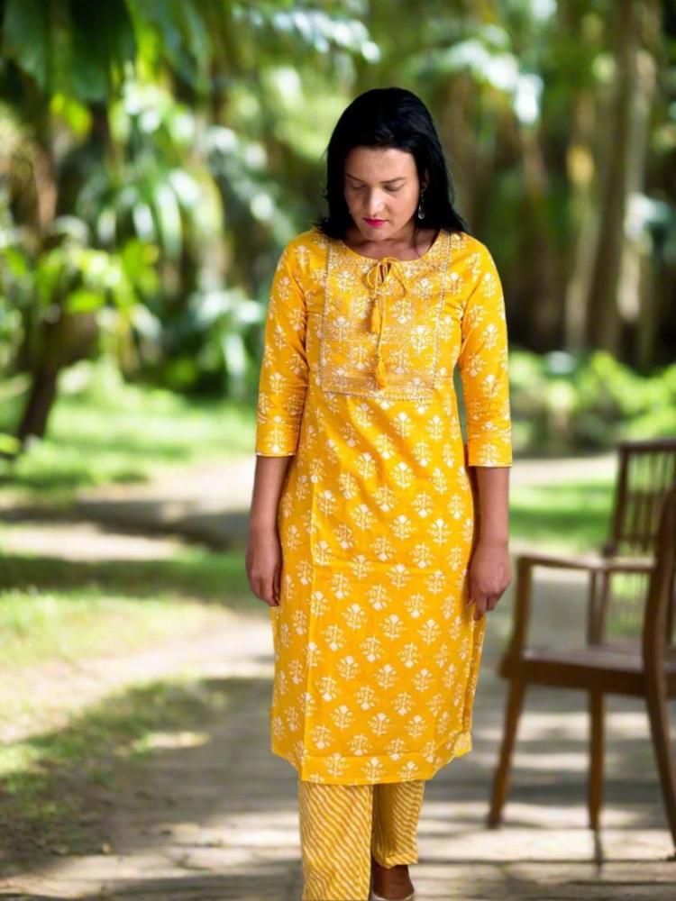 Kurta Details: Fabric: Cotton Neckline: Elegant Round Neck with Tessel’s Sleeves: 3/4th sleeves Length: Knee-length, perfect for both casual and formal occasions Bottom Details: Fabric: Soft and breathable Lahria Printed cotton Length: Ankle-length, creating a sophisticated look Care Tip: Machine washable and easy to maintain, making it a practical choice for your busy lifestyle. Style Tip: • Choose minimalistic accessories like stud earrings or a delicate bracelet to keep the look understated and effortless. Note: Slight color changes are expected due to camera settings and lighting effects, due to which exchange or return is not accepted. |